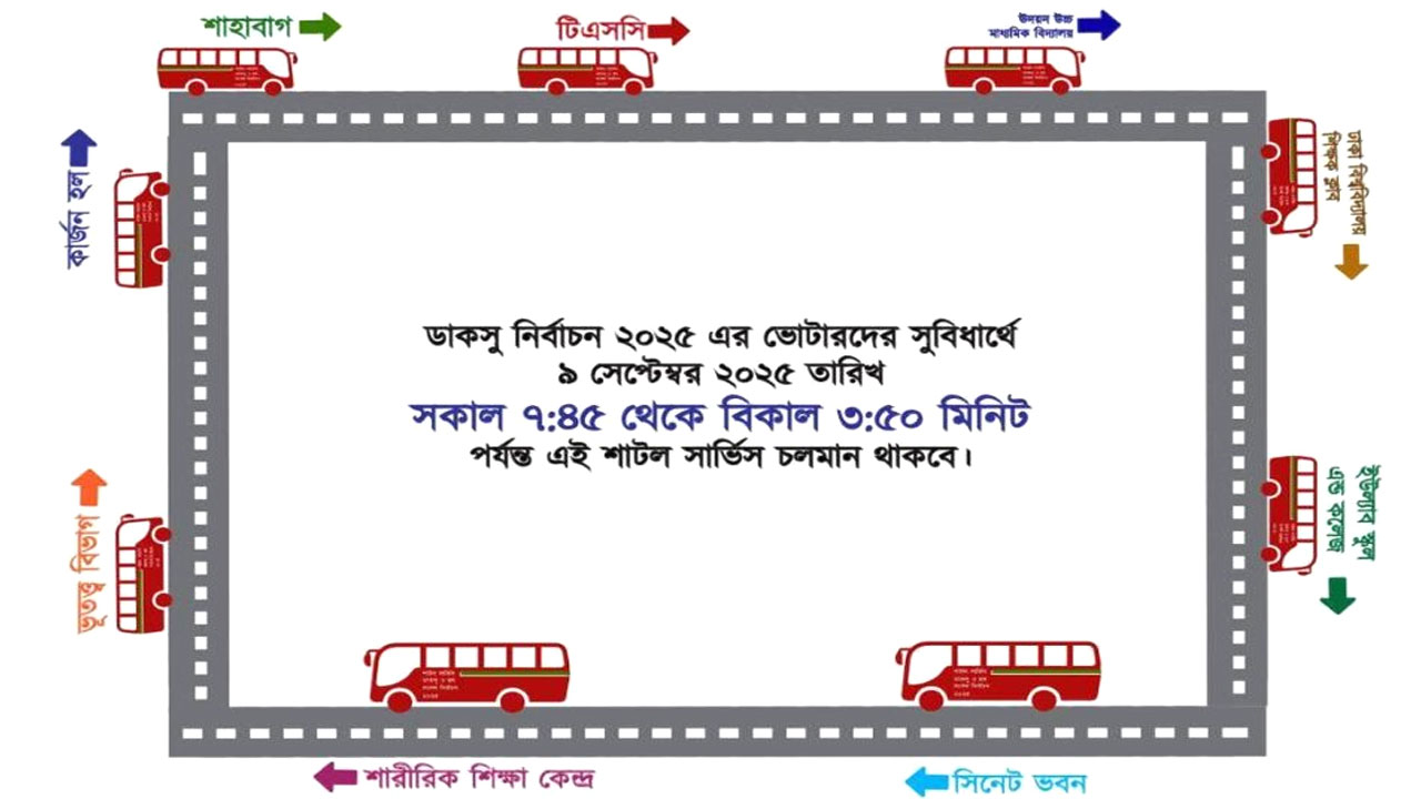 এতে বলা হয়, ডাকসু নির্বাচন ২০২৫’র ভোটারদের সুবিধার্থে ৯ সেপ্টেম্বর সকাল ৭টা ৪৫ মিনিট থেকে বিকেল ৩টা ৫০ মিনিট পর্যন্ত শাটল সার্ভিস চলবে।