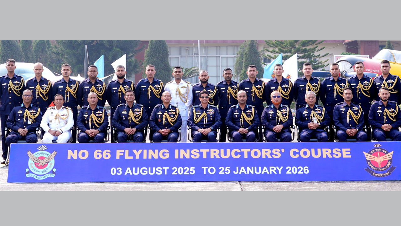 বাংলাদেশ বিমান বাহিনীর ৬৬ তম ফ্লাইং ইনস্ট্রাক্টর্স কোর্সের সনদপত্র বিতরণ অনুষ্ঠান রোববার (২৫ জানুয়ারি) বাংলাদেশ বিমান বাহিনী ফ্লাইং ইনস্ট্রাক্টর্স স্কুল, এরুলিয়া এয়ারফিল্ড, বগুড়ায় অনুষ্ঠিত হয়েছে।