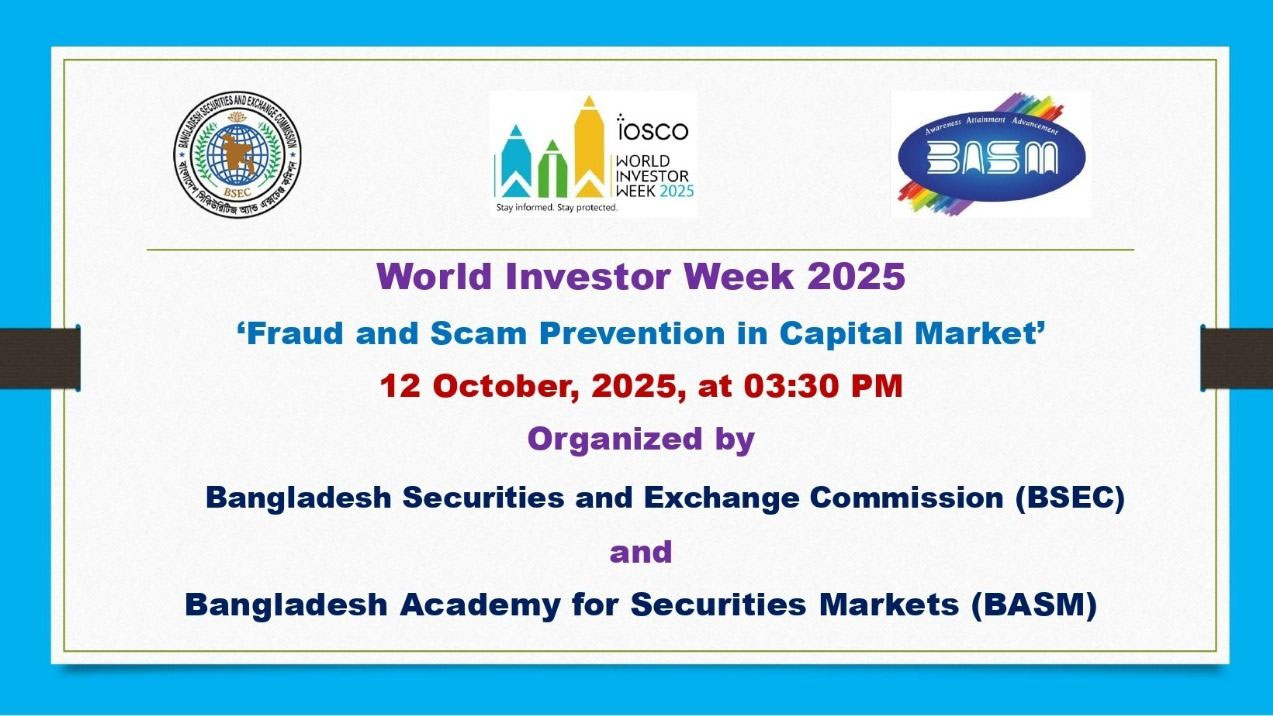 বাংলাদেশ সিকিউরিটিজ অ্যান্ড এক্সচেঞ্জ কমিশনের (বিএসইসি) নেতৃত্বে এবং আন্তর্জাতিক সিকিউরিটিজ কমিশন সংস্থার (আইওএসসিও) পৃষ্ঠপোষকতায় বাংলাদেশে পালিত নবম বিশ্ব বিনিয়োগকারী সপ্তাহ-২০২৫ (ওয়ার্ল্ড ইনভেস্টর উইক টোয়েন্টি টোয়েন্টি ফাইভ) উপলক্ষে একটি সেমিনার সফলভাবে সম্পন্ন করেছে বাংলাদেশ একাডেমি ফর সিকিউরিটিজ মার্কেটস (বিএএসএমে)।