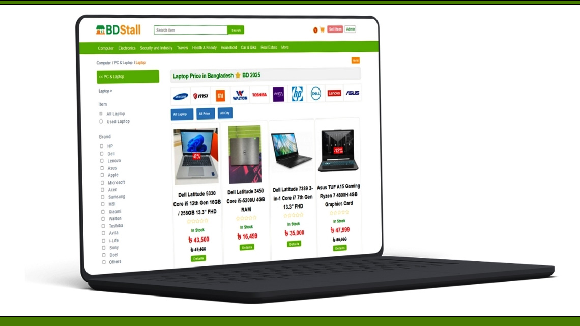 প্রযুক্তি নির্ভর বাংলাদেশে ল্যাপটপের চাহিদা দিন দিন বাড়ছে। এই চাহিদা পূরণে বিডিস্টল একটি নির্ভরযোগ্য এবং আধুনিক প্ল্যাটফর্ম হিসেবে প্রতিষ্ঠিত হয়েছে। অনেক বেশি সংখ্যক ল্যাপটপের ব্র্যান্ড মডেল ও বিক্রেতা নিয়ে বিডিস্টল এখন বাংলাদেশের সবচেয়ে বড় ল্যাপটপের ডিজিটাল মার্কেটপ্লেস। আপনি যদি নতুন বা পুরাতন ল্যাপটপ কেনার কথা ভাবছেন, তাহলে বিডিস্টল এর ওয়েবসাইট (www.bdstall.com) ভিজিট করে কাংক্ষিত ল্যাপটপ টি নিতে নিতে পারবেন।