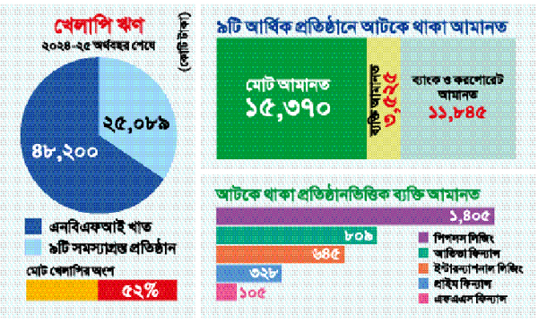 বাংলাদেশ ব্যাংকের সর্বশেষ তথ্য অনুযায়ী, নন-ব্যাংক ফিন্যান্সিয়াল ইনস্টিটিউশন (এনবিএফআই) খাতের মোট খেলাপি ঋণের ৫২ শতাংশই এই ৯টি প্রতিষ্ঠানের দখলে। গত অর্থবছরের শেষে এসব প্রতিষ্ঠানের খেলাপি ঋণের পরিমাণ দাঁড়িয়েছে ২৫ হাজার ৮৯ কোটি টাকা, যা পুরো খাতের গভীর কাঠামোগত সঙ্কটের স্পষ্ট প্রতিফলন।