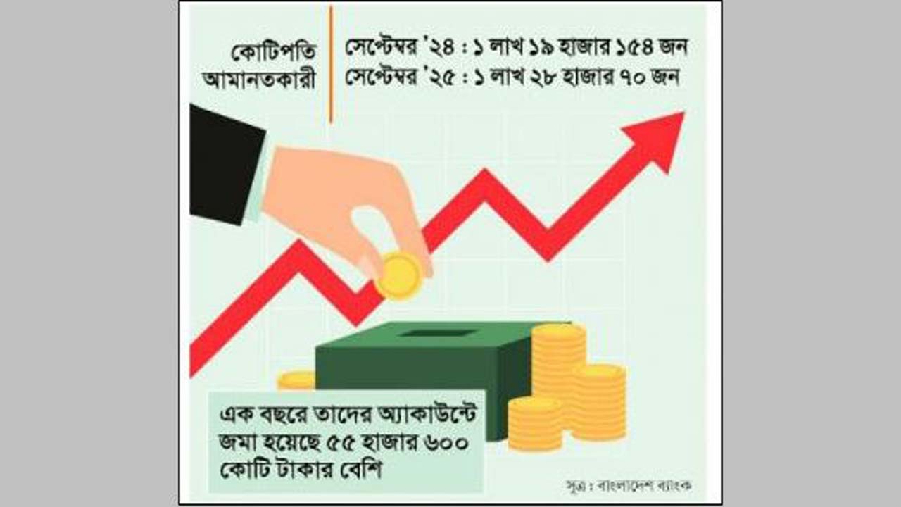কোটিপতি তালিকা-সঙ্কটের মধ্যেও ৭.৫% বৃদ্ধি : বাংলাদেশ ব্যাংকের তথ্য বলছে- গত বছরের সেপ্টেম্বরে কোটিপতি আমানতকারী ছিল-১ লাখ ১৯ হাজার ১৫৪ জন। আর চলতি বছরের সেপ্টেম্বরে এ সংখ্যা ১ লাখ ২৮ হাজার ৭০ জন। অর্থনৈতিক ধসের সময় কোটিপতি আমানতকারীর সংখ্যা প্রায় ৭.৫% বেড়ে যাওয়া বিশেষজ্ঞদের মতে, ‘স্বাভাবিক বাজারের আচরণ নয়।’