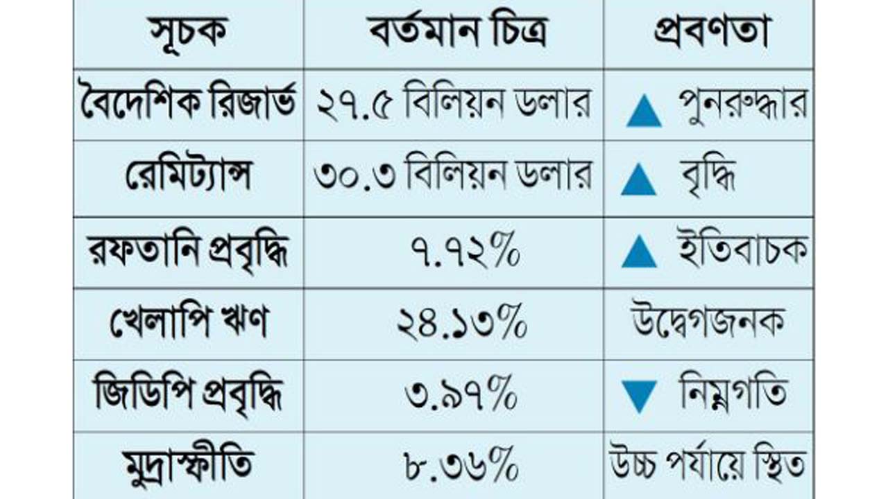 অর্থনীতিবিদদের মতে, রফতানি প্রবৃদ্ধি ও প্রবাসী আয় ইতিবাচক হলেও বেসরকারি বিনিয়োগের স্থবিরতা, উচ্চ মূল্যস্ফীতি ও ঋণখেলাপি বৃদ্ধির কারণে অর্থনীতির গতি মন্তর।