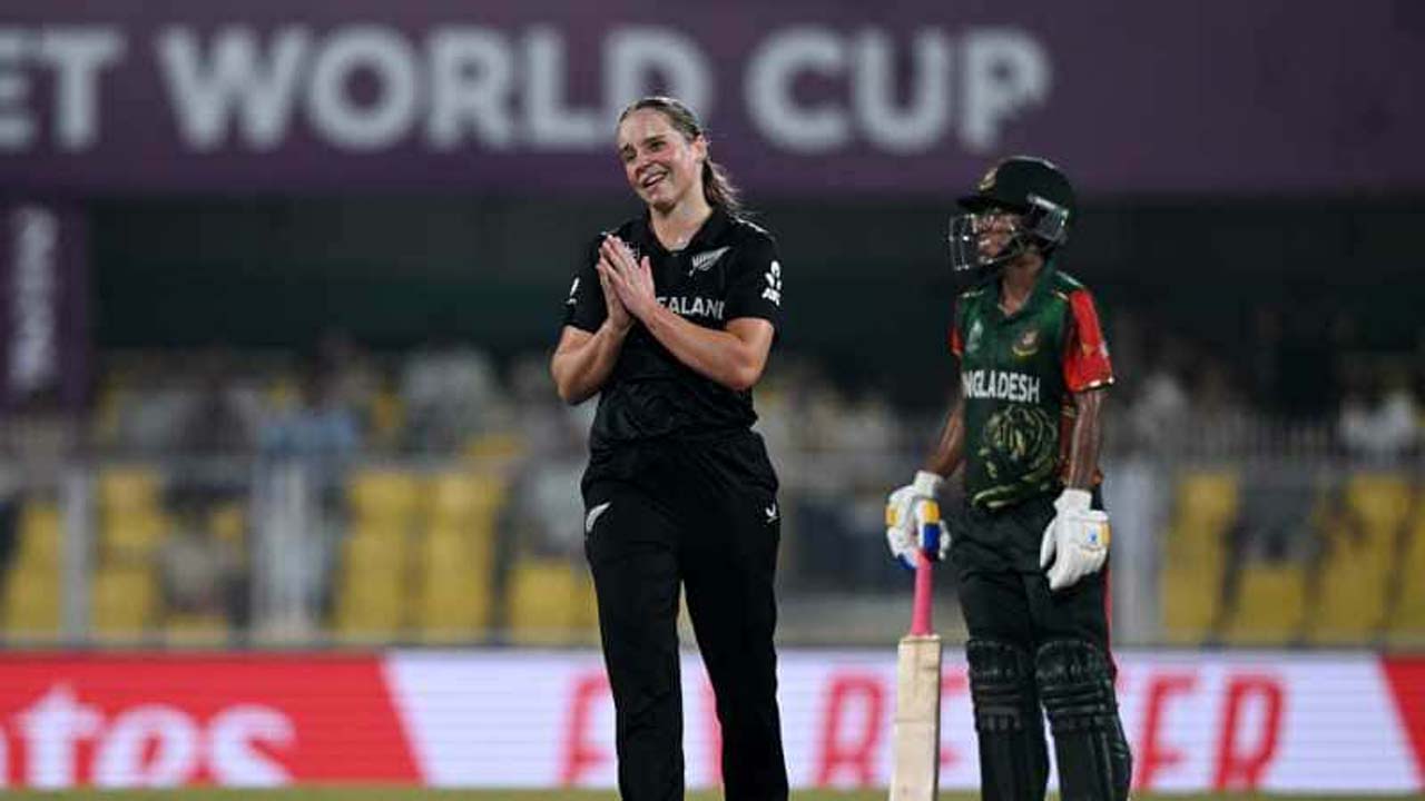 এরপর চতুর্থ উইকেট জুটিতে ১১২ রান যোগ করেন সুফি ডিভাইন ও ব্রুক হ্যালিডে। দু’জনেই পেয়েছেন ফিফটির দেখা। ১৫০ রানের মাথায় ১০৪ বলে ৬৯ রান করা হ্যালিডেকে থামান ফাহিমা খাতুন।