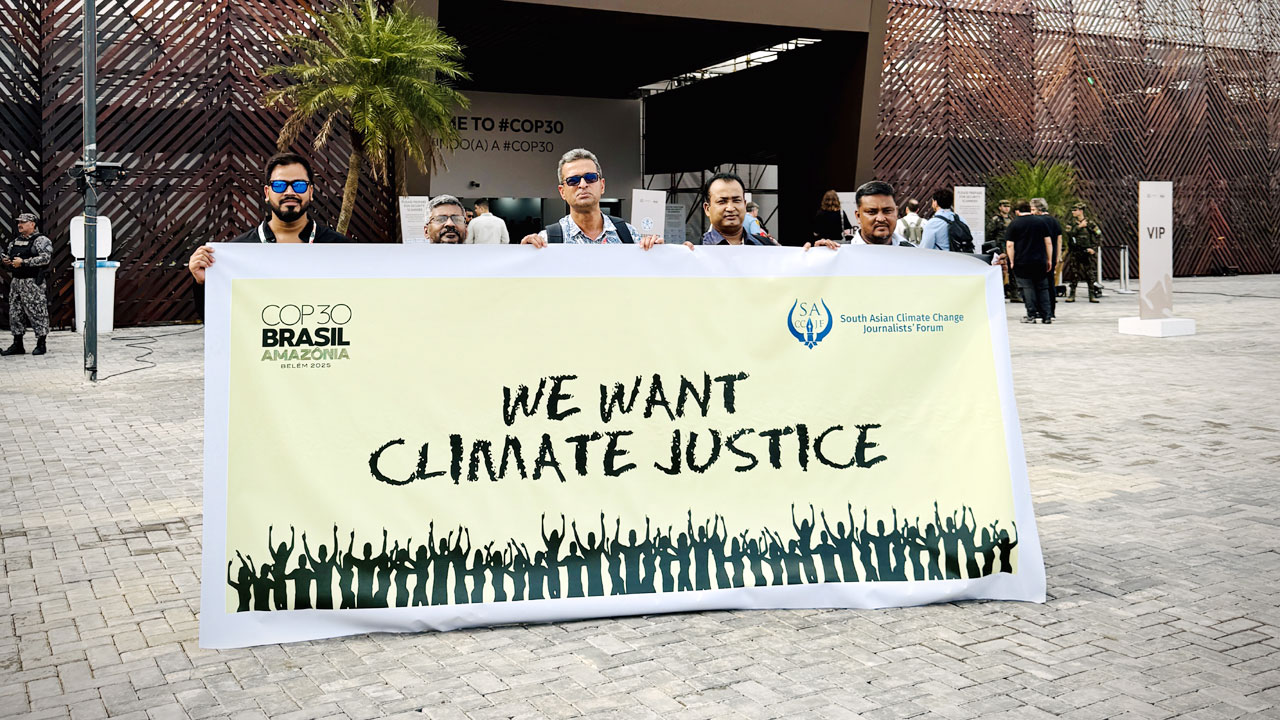 দুর্যোগ থেকে দক্ষিণ এশিয়াকে বাঁচাতে ব্রাজিলের বেলেমে অনুষ্ঠিত বিশ্ব জলবায়ু সম্মেলনস্থলে সাউথ এশিয়ান ক্লাইমেট চেন্জ জার্নালিস্টস ফোরামের অবস্থান প্রতিবাদ ।